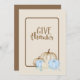 Obrigados felizes que anunciam o convite. Este belo azul de férias, obrigados felizes de abóbora creme com cartão, dá um arranjo lindo de abóboras e folhas azuis e ferrugem, adicionando um toque colorido de verde e folhagem. Esta coleção certamente adiciona um toque maravilhoso à sua celebração festiva.