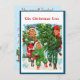 Este brilhante e colorido Convite para natais vintages lembra uma de suas crianças enquanto vemos crianças felizes e alegres trazendo a árvore de Natal de volta para casa depois de cortá-la na floresta.