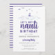 Um modelo aniversário de 30 anos náutico moderno, elegante e chic, com impressão de tinta de uma cena de água com ondas oceânicas, barco e gaivotas. Uma design divertida, "vamos ganha nauti" para uma garota de aniversário moderna e uma balsa com as meninas, com família e amigos etc. Uma escolha encantadora para uma festa de aniversário de praia, uma festa de aniversário costeira, um lago, festa de aniversário de borda d'água ou um barco ou festa de aniversário de iate.