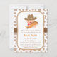 Yeehaw! Este convite tem um bebé bonito vestir um chapéu de vaqueiro com ícone da estrela e afagar um brinquedo alaranjado ingualmente adorável do travesseiro do ralo do cavalo do tan do marrom. Fundo do teste padrão branco e marrom do animal do impressão da pele da vaca. Um golpe, convite bonito a convida convidados para esses temas ocidentais e de Texas do chá de fraldas! Personalize com detalhes do partido entre o espaço disponível.