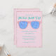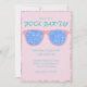 Este convite personalizado apresenta um tema de Festa de Piscina com estilo retrorativo e glamouroso em um fundo cor-de-rosa suave com letra de cor lacre ou turquesa. Uma imagem de um par de óculos escuros cor-de-rosa é colocada sobre o centro. As lentes dos óculos apresentam um reflexo da água da piscina.