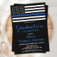 Convites para Graduação da Polícia de Linha Azul-fina. Comemore sua nova academia de polícia, e convide amigos e familiares para a festa de formatura de seu policial com este Convite à Graduação da Polícia de Bandeira Azul Thin. DESIGN americano na Polícia de Sinalizador, cores modernas, preto branco e design azul. Este convite para a formatura do policial também é perfeito para convites de aposentadoria da polícia, mudança de local na personalização. Veja a nossa coleção para combinar presentes de formatura policial, favores de festas de formatura da academia de polícia e suprimentos. COPYRIGHT © 2021 Judy Burrows, Black Dog Art - Todos Os Direitos Reservados. Convidado do Oficial de Polícia da Academia de Graduação em Linha Azul-Thin