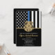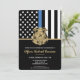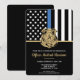 Honre a dedicação e o trabalho de duro de um novo oficial de polícia com este convite de formatura policial personalizável. Apresentando um crachá policial e a bandeira da polícia com riscas brancas e pretas e uma orgulhosa linha azul fina, esta design simboliza força, serviço e sacrifício. O convite é personalizado com o nome do formando em letras douradas, fazer-o como uma lembrança memorável para amigos, familiares e colegas oficiais. Perfeito para celebrar a graduação, promoção ou marco de uma academia de polícia na carreira de um futuro oficial. Convide seus convidados em estilo e mostre suporte para o membro mais novo da comunidade de linha azul fina.