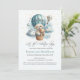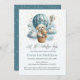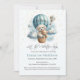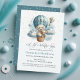 Captivando o convite do chá de fraldas "Deixe a Aventura Começar" com um adorável filhote branco segurando um ursinho de pelúcia cavalgando em um balão de ar quente. O fundo do céu com aquarela é cheio de nuvens brancas e lacrimejantes com estrelas douradas circundantes. Padrão de estrelas brancas em terreno sólido na parte de trás do convite. Modelos fornecidos.