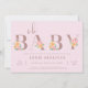 Um convite bonito e cinza com "Oh Baby" em ouro falso rosa, com "baby" decorado com buquês de cor d'água de rosas cor-de-rosa e laranja num fundo cor-de-rosa pincelado.