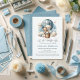 Captivando o convite do chá de fraldas "Deixe a Aventura Começar" com um adorável filhote branco segurando um ursinho de pelúcia cavalgando em um balão azul de ar quente. O céu azul de aquarela tem nuvens brancas com estrelas douradas circundantes. Padrão de estrelas brancas sobre fundo azul no fundo do convite. Modelos fornecidos.