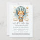 Captivando o convite do chá de fraldas "Deixe a Aventura Começar" com uma adorável raposa segurando um ursinho de pelúcia cavalgando em um balão de ar quente. O céu lacrimogêneo tem nuvens brancas com estrelas douradas circundantes. Padrão de estrelas brancas sobre fundo negro no fundo do convite. Modelos fornecidos.