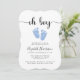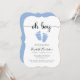 Um chá bonito para o bebê, chamado "oh boy" em um roteiro de na moda com pântanos e uma cor azul pastel de pés de bebês.