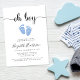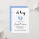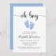 Um convite para chá de bebê mirim bonito com "oh boy" em um roteiro de na moda com baloiços e uma cor azul pastel de pés de bebês. Por baixo, você pode personalizar facilmente os detalhes do chá.
