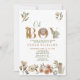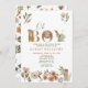 Crie o anúncio perfeito do bebê + convite do chá de fraldas com este moderno tema 'Oh Boy' boho safari animais design, com girafa pintada à mão, leão e animais elefantes decorando a palavra 'boy'. A parte de trás do cartão apresenta uma ilustração do tema animais da selva floral. Copyright Elegant Invites, todos os direitos reservados.