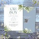 Oh, chá de fraldas convite com elegante tipografia azul empoeirada e bonito folhagem botânica verde, e seu código QR no verso. Projetado por Thisnotme©