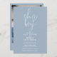 Este convite à chá de fraldas elegante de script azul empoeirado pode ser personalizado com todas as suas informações especiais de celebração e fotos especiais no verso. Projetado por Thisnotme©