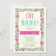 Oh Chá de fraldas aqua azul e rosa quente, convite para a fronteira floral moderno. A frase "Oh baby" em aqua e rosa quente combinada com uma ilustração de uma fronteira floral feita de lindas flores selvagens e folhas verdes de azeitona são os elementos deste adorável convite.