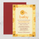 a design da frente mostra um belo convite para chás de fraldas em tipografia amarela e marrom e um texto "oh baby" no topo com uma flor dentro dela. esta design é bonita e será ideal para o seu chá de fraldas.