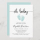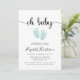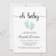 Um convite de chá de fraldas com um mínimo de sexo neutro com "oh baby" num guião de na moda com baloiços e uma cor verde-d-água pastel de menta de pés de bebês.