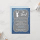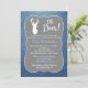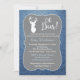 Design apresenta uma silhueta branca com cor azul suave e cinza em uma borda de fundo denim. Uma mistura elegante de scripts e fontes de bloqueio faz disso a escolha perfeita para qualquer chá de fraldas de tema, tema de caçador, tema de veados ou convite para chás de garotos.