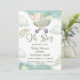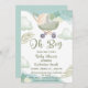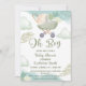 Esta aquarela nuvens oh menino bebê chá convite apresenta carrinho de bebê em cor verde-oliva com balões e nuvens e folhas de aquarela com fundo em verde-menta e verde-oliva.