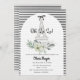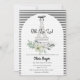 Este elegante convite de chá de fraldas preto e branco Oh La Paris inspirado será o começo perfeito para o seu chá de fraldas temático francês. Apresentando a Torre Eiffel, um arco de moda e flor de aquarela. Um convite romântico neutro para um chá de fraldas de Paris.