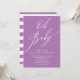 Convite para chá de fraldas das meninas modernas, com um script de caligrafia definido em um fundo de lavanda com uma faixa de lavanda e branca.