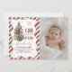 A festive holiday-themed first birthday photo invitation featuring red, green, and white striped borders, elegant Christmas greenery with red bows, and gold snowflake accents. The “Oh What Fun” headline adds a cheerful seasonal touch, paired with space for a personalized baby photo. Perfect for winter or Christmas birthday celebrations, this design is ideal for girls’ first birthdays and customizable with party details.