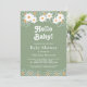 Este moderno convite de chá de fraldas neutro em termos de gênero é decorado com margaridas e tipografia na moda num fundo verde de sábio.