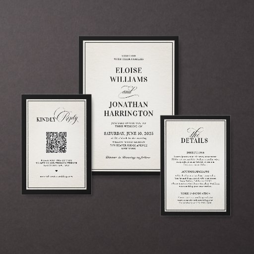 This old money inspired black and ivory wedding invitation pairs timeless serif typography with a coordinating black reverse side featuring a discreet QR code for modern convenience. The bold black border frames the refined layout, creating a sophisticated black tie aesthetic rooted in tradition yet elevated for today’s celebrations.