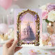 Featuring a majestic castle, delicate pink florals, shimmering gold glitter frames, and touches of boho charm, it sets the perfect tone for a royal celebration. Imagine your guests entering a grand palace filled with sparkle, floral beauty, and princess magic — the ultimate Once Upon a Time experience Perfect for baby showers, princess-themed parties, or magical first birthdays, this design blends elegance and whimsy for your little girl’s fairytale beginning.