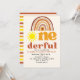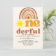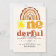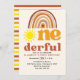 Celebrate your baby's first birthday with our boho-style design featuring the phrase "ONE-DERFUL" in retro typography and a boho-style sunburst. This design is perfect for celebrating your little one. The design features retro colors and can be personalized with your party details. Don't hesitate; get yours now!
