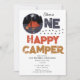 A beautiful hand drawn camping birthday invitation design. A cute "One happy camper" camping themed first birthday party invitation. A cute camper themed birthday invitation that can be customized to your details.