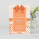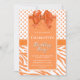 Comemore suas celebrações de aniversário com este convite de aniversário cor de laranja e branca apresentando um arco festivo, bolinhas e faixas de zebra enquanto o texto é enquadrado com uma falsa borda de brilho.