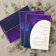 Douradas manchas astrais, dando a impressão de estrelas no céu, brilham acima das palavras sobre um fundo roxo. Um tema moderno para um convite de casamento na moda. Convite on-line descarregável Altere facilmente as informações de seu próprio design personalizado.