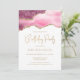 Este convite de aniversário de tendências apresenta uma imagem de aquarela de um geode agado em tons de rosa, cortados com realces de brilho dourado falsos. As palavras "Festa de aniversário" aparecem na falsa brilha dourada em letra decorativa moderna de escrita manual. Personalize-o com o nome da honrosa na fonte de deco de arte dourada e os detalhes da parte no tipo de serifa dourada em um fundo branco. A mesma imagem cor-de-rosa é exibida no verso.
