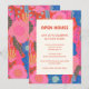 Celebrate your new home with this vibrant open house invitation featuring a bold tropical floral border in pink, orange, and blue. The modern botanical design with abstract leaves and flowers creates a fun, welcoming atmosphere for your celebration. Fully customizable with your party details, address, and time. Perfect for casual drop-in style housewarming events.
