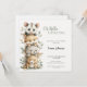 This woodland baby shower invitation features a charming stack of cute watercolor woodland animals, with a sweet opossum at the top surrounded by soft greenery. The gentle forest colors and hand-painted style create a warm and playful look, perfect for a gender-neutral woodland baby shower.