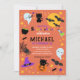 Celebre seu aniversário assustador com este convite de aniversário de Dia das Bruxas, maníaco e mestiço. Esta design apresenta uma variedade de personagens do Dia das Bruxas e doces sobre um fundo laranja na frente, e doces do Dia das Bruxas e estrelas sobre um fundo preto no verso.