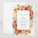 This design features a vibrant arrangement of watercolor poppies and ranunculus in shades of fiery orange and deep red. Lush sage green foliage intertwines with the blossoms to create a warm and inviting seasonal atmosphere. The artistic style brings a soft yet striking touch to the composition.