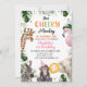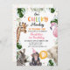 Pink Hat Our Cheeky Monkey Invitation Qualquer idade nosso pequeno convite de aniversário para macacos bonitos, e vários outros animais da selva, chapéu de festa rosa, balão laranja e folhagem tropical. Este convite de aniversário de macacos-prego também apresenta uma palavra multicolorida.