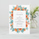 This design features a cluster of vibrant orange poppies and lush teal foliage. The watercolor aesthetic creates an airy and romantic mood perfect for a warm weather event. Bright tangerine petals are complemented by delicate greenery and budding wildflowers against a clean white backdrop.
