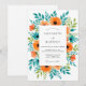 Vibrant orange poppies and stylized teal flowers create a striking watercolor arrangement. Lush green and blue foliage surrounds the central area, providing a fresh and breezy summer aesthetic. This botanical design features a warm and cool color palette, perfect for an artistic outdoor ceremony. The soft petal textures and detailed leaves offer an elegant and cheerful mood.