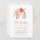 Esses adoráveis convites para o chá de bebê apresentam estilo de vassoura de tendências e roteiro manuscrito que diz "oh baby". Um arco-íris trágico e neutro pintado é decorado com flores de cor de laranja e pêssego em um simples fundo branco.
