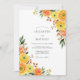 A vibrant watercolor design featuring clusters of cheerful orange and sunny yellow blooms with hints of green foliage. This artistic arrangement evokes a feeling of warm romance and joyful celebration. The painterly style adds a delicate, handcrafted charm.
