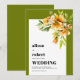 Rhododendron branch with orange, yellow flowers fall wedding Invitation. This sophisticated wedding invitation showcases a minimalist white frame adorned with orange, yellow rhododendron blooms, accented by delicate olive green foliage nestled in the upper right corner. Soft olive green borders frame the design, enhancing its refined elegance, while clean, modern typography in bold strokes adds a sleek, contemporary edge. The reverse features a solid olive green backdrop that harmonizes with the front, creating a unified, stylish aesthetic.