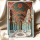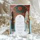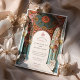 Este luxuoso convite de casamento islâmico mostra um cenário arquitetônico espantoso adorado com intrincados padrões florais, arcos e uma grande cúpula decorativa. Apresentando flores cor-de-rosa suave, sotaques de ouro e colunas de árvores, o design reflete uma elegante fusão de arte islâmica e Arte Nouveau influências. Padrões simétricos, trabalho em linha detalhado e tons vibrantes de azul, vermelho e verde criam um eterno e estética sofisticada, perfeito para casais que buscam um anúncio de casamento inspirado na cultura e ornamentado.