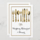 Uma ilustração de facas, garfos e colheres antiquadas têm rosas, lírios e gramíneas intrincados neles gravados e são emoldurados por uma fina estrutura de ouro em branco. Uma espiral floral de ouro na moda separa o gráfico de modelos que podem ser personalizadas para se adequarem ao seu casamento, noivado ou aniversário especial.