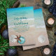 Casamento de Natal num local tropical. Use como um casamento de cruzeiro de Natal, ou outro. Mares tropicais e areia de praia são o pano de fundo de quatro modelos de texto em roteiro preto. Um dólar branco de areia, estrela marrom (starfish) e ornamento de árvore azul-aqua decoram o fundo da papelaria. As costas também têm uma imagem de mar e areia.
