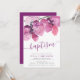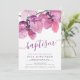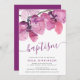 Um belo convite batismo para sua garotinha, com um grande ramo de orquídea roxa, com "batismo" na letra moderna do roteiro de caligrafia, e os detalhes do evento em cinzas escuras e fontes sans serif roxas. O inverso está em roxo sólido.