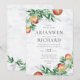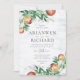 O pomar de Verão é uma fruta abundante, uma casa rural rústica sente-se com galhos suspensos carregados de fruta. Esta é uma design de aquarela de verão divertida, com pêssegos, laranjas, cores escamosas complementadas por verde e flor delicada.