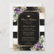 Um convite à apresentação de 16 anos elegante, preto e dourado, de cor floral, com um quadro de ouro adornado com orquídeas roxas e brancas e com brilho dourado.