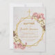 Este elegante convite para o batismo floral tem uma estrutura irregular de ouro com buquês de flores de orquídeas brancas e cor-de-rosa para cima e para baixo sobre dois hexágonos de ouro que se sobrepõem a um fundo de mármore branco, com uma cruz de ouro no topo. O nome do bebê está escrito em um roteiro caligráfico elegante. Todo texto tem uma cor amarela ouro, como o quadro dourado. O buquê de flores com orquídeas cor-de-rosa e brancas é de um cartão postal antigo de Bertha Maguire (1862-1910), agora no dominio público.