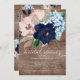 Os azuis marinhos bonitos, coram & chá de panela empoeirado das flores do azul com uma pia batismal moderna da caligrafia ajustada em um fundo de madeira rústico. lance nosso convite do chá de casamento ver sobre uma parte traseira floral de coordenação dos azuis marinhos para um toque especial extra. Fácil personalizar com sua informação do partido.